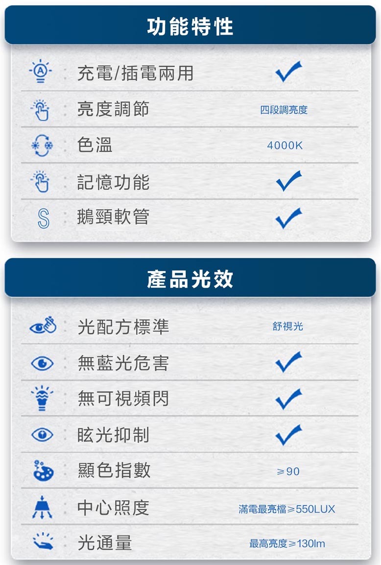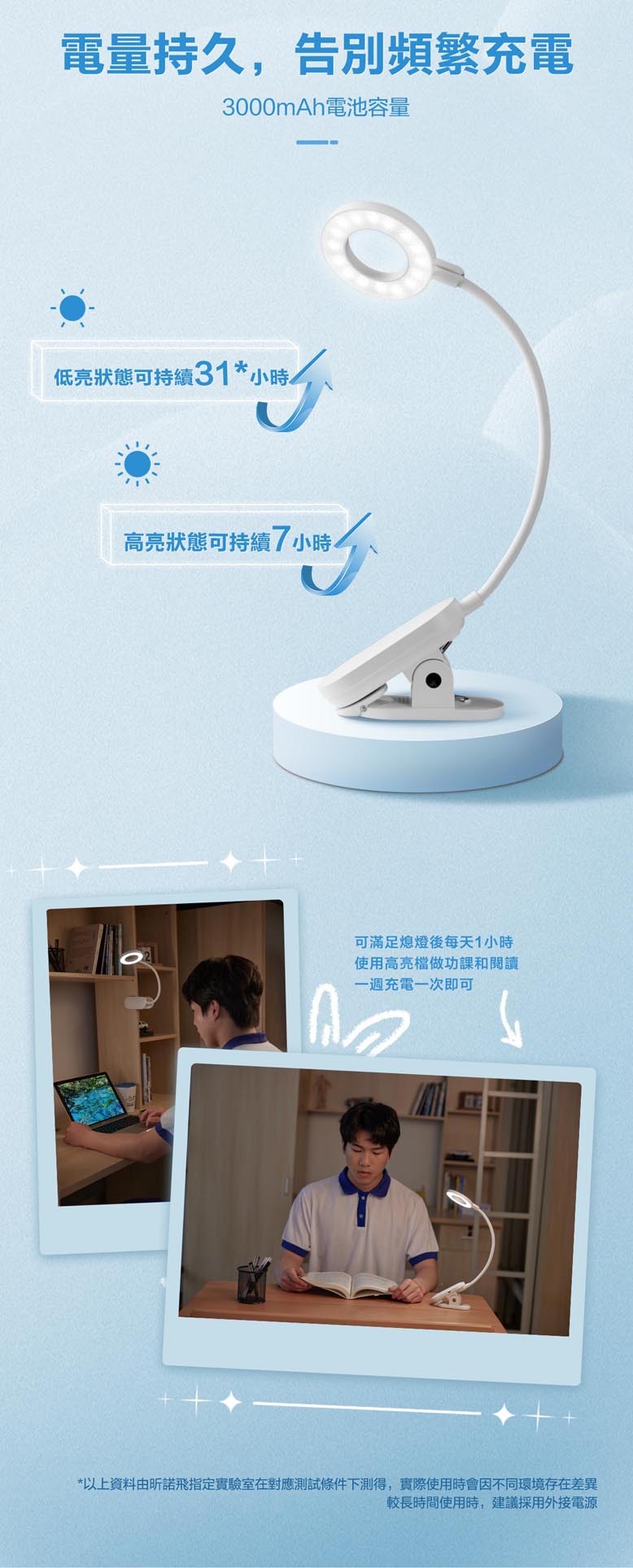 | 續航時間 | 高亮7小時續航 | 低亮31小時續航 |
